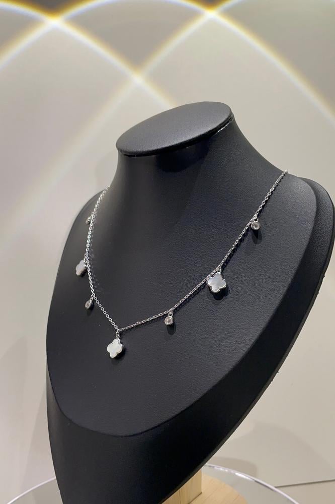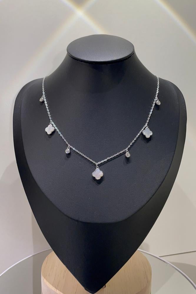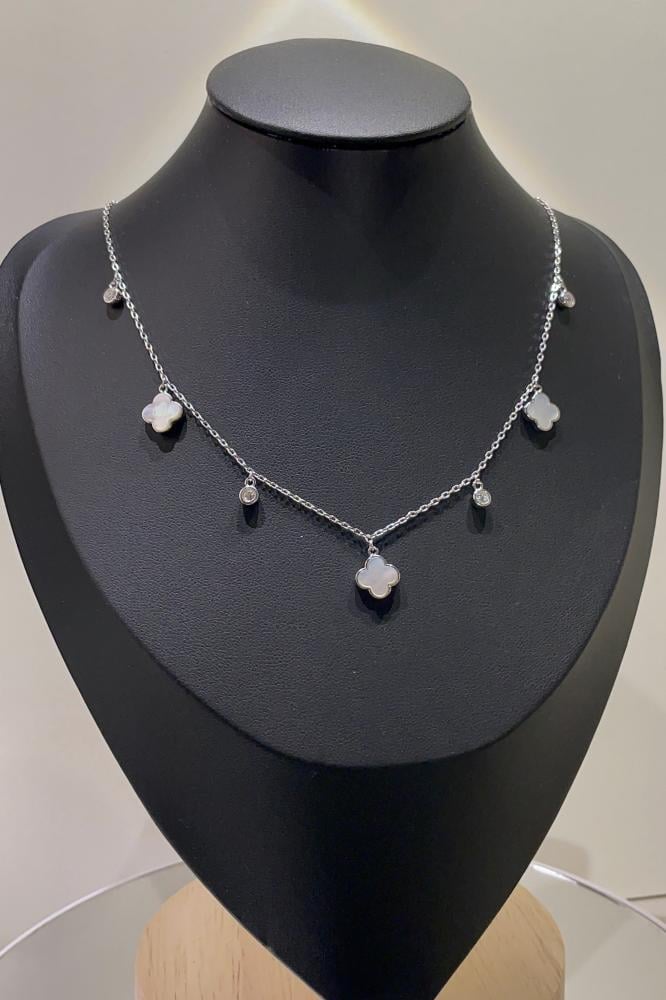 تقدم لك وهج هذا السلسال ذو التصميم الرائع مستوحى من تصاميم فان كليف مزين باللون الابيض وأحجار الزركون اللامعه (شبيه الالماس).. مناسب للإهداء أو الاقتناء الشخصي ( سلسال مصنوع من الفضة الخالصة )